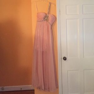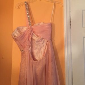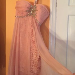This is a light pink dress with en embellished over the shoulder strap. It is a short dress that is draped over with a longer skirt that opens in the middle front. The dress is lace with a sheer pink layer under it. It has an open back. The dress is above the knee but the skirt drapes all the way from the top to the floor. I wore it once to a junior prom and it's been in my closet since. No stains. No tears. Zipper is difficult but it's been that way since I bought it. Flexible pricing !!