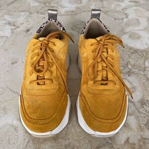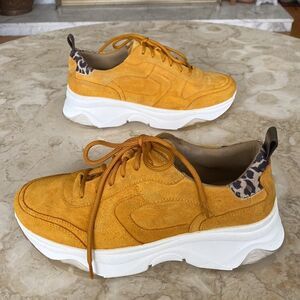 In very good preowned condition super cool PS Poelman (Netherlands) chunky platform sneakers. These cool sneakers feature a mustard yellow suede leather upper with leopard print heel cuff. Nicely padded so quite comfortable.