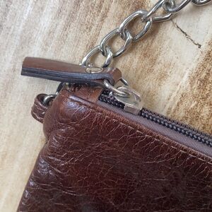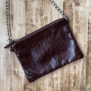 Genuine leather shoulder bag. Beautiful dark brown genuine leather. Made in Italy. In great condition. Measurements are 7.75x5.5x0.5” with a 20.5” silver chain strap.