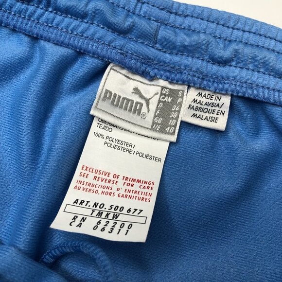 Puma sporty active athletic skirt in a bright baby blue color with red sporty stripes down the side. Puma logo embroidered in red on the bottom right corner and back right side. Inner drawstring inside elastic waistband for a secure fit. Small slits up the sides. Two functional pockets up the front. Great for being active or on the tennis field or golfing. Makes a great longer tennis skirt. In excellent used condition with no flaws. Please see photos for measurements and details. Women's size SMALL.
