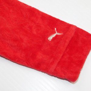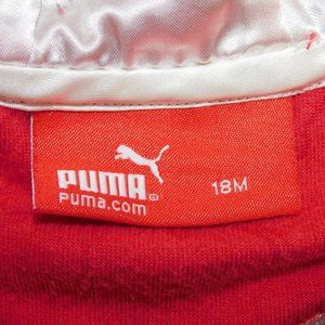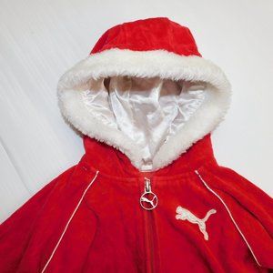 This super cute Puma Girls 18 Months Red Velour Full zip Hoodie / Track Jacket with faux fur Trim and Satin Lined Hood is in Excellent clean condition. Hoodie is 66% Cotton - 34% Polyester - Machine washable. Features Puma Emblem zipper pull, faux fur Trim, satin lined hood and entirety of the outside has the Puma embossed in the velour.