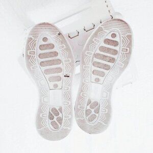 These sneakers feature a sleek white design with a light blue accent stripe, offering a modern and stylish look.