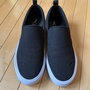 Another pair of shoes that were worn only once (outside). They are in excellent condition. Jet black with a bright white platform look. Size 9 or 40 EU. Slip-on style with canvas upper and superior cushioning.