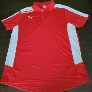 PUMA Sportlifestyle Men's Polo Size Large Short Sleeve Golf Shirt Venting on sides and on shoulders. 100% Polyester Red White Gold Excellent Condition