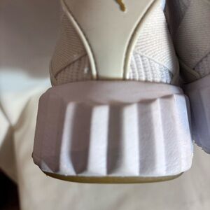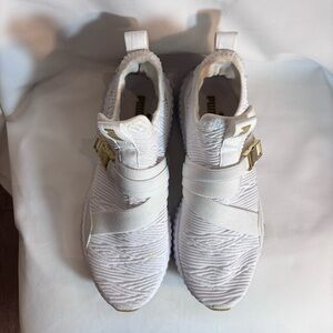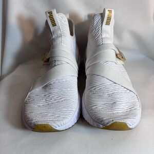PUMA Sz 9.5 High Top White Textured Sneakers with Rise Gold Buckle Rubber Sole Sleek white knit sneakers. Gold logo accents. Unique strap design.