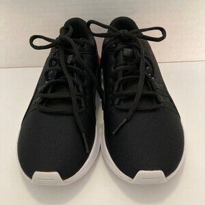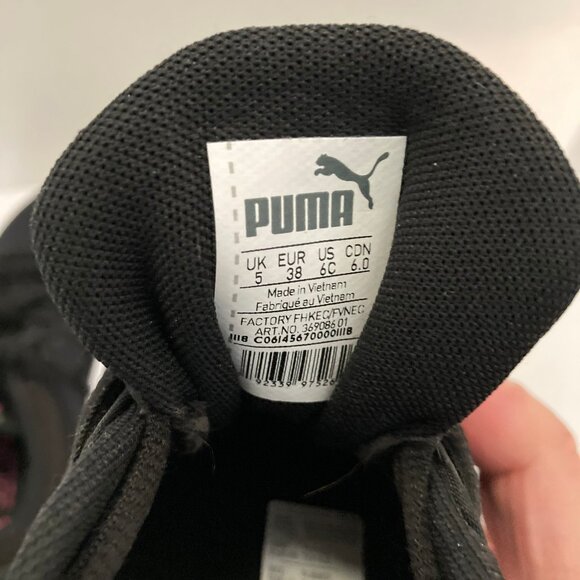New pair of Puma Adela running shoes. Size 6. Black with black Puma stripe and pink accent on the heal. Soft foam insole for optimal comfort.