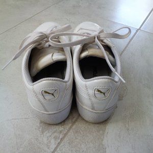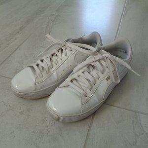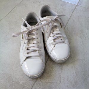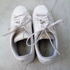 The PUMA Vikky platform patent is a basketball inspired womens platform sneaker featuring a rich shiny finish. The platform tooling is joined with a full soft patent synthetic leather upper. The shoe also features the SoftFoam comfort insert to keep your feet fresh. A fashionable highlight in your wardrobe