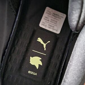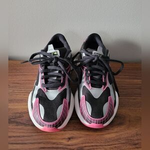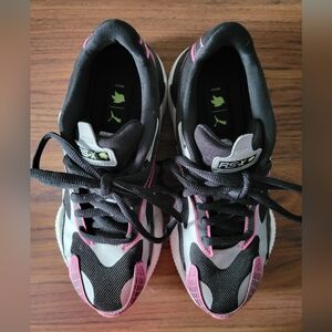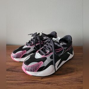 Puma x Sega RS-X3 running shoes with Sonic the Hedgehog theme. Black, pink and white colour way. Blend of mesh and synthetic materials ensures breathability and comfort, while the chunky sole provides excellent cushioning and support. Designed with a retro flair, these trainers are inspired by Sega's iconic gaming legacy, making them perfect for gamers who want a fusion of style, comfort, and nostalgia.