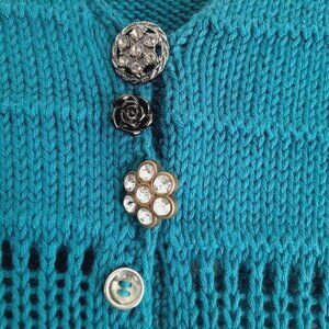 • Long sleeve button down knit long, tunic cardigan in teal blue/green hue with unique miss-matched gem rhinestone floral... buttons.