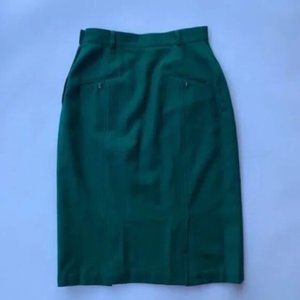 Beautiful vintage 1950's skirt made of 100% wool in emerald green color. High rise with two front jetted pockets and back pockets. Side zipper and button closure. Has two central back vent to allow more movement and belt loops on waistband. Midi length. Hits just below knee depending on height. Entirely lined with satin. Please see measurements below.