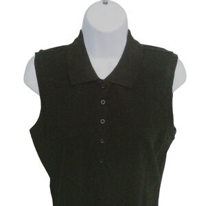 Black, sleeveless, collared, half-button down sports top. Tennis style fabric. Extra long. Two small slits on along the hemline.