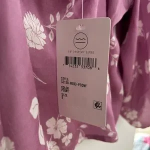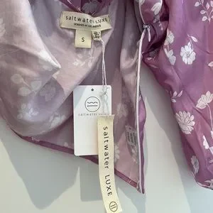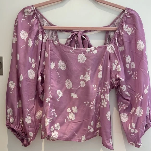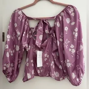BRAND NEW WITH TAGS. Designed in Los Angeles. True colour is a light purple. Pretty light floral blouse with adjustable ribbon in the back. Could be off the shoulder too. Fits a range of sizes. Slight crop: 12 inch shirt length (collar to bottom)