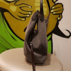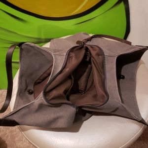 Like new, Hynbase (Korean made) women's shoulder tote bag. High quality, soft eco canvas material with dark brown pleather straps. Medium grey in colour. Three deep pockets. 2 outside pockets with metal snaps and middle pocket contains small zip pocket and tri open pockets that close up with one big zipper which enable you to keep everything safe and secure. FLAWLESS.