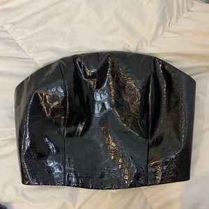 Brand new condition tube top, it is a PVC material with an alligator skin print on it. Doesn’t feel cheap either. On the inside around the edges it has a rubber strip to hold it in place. Just for size reference, I am 5’9 and I do have a longer torso. The length in the front/centre is 11” and the back is 5 1/2”
