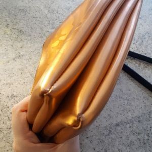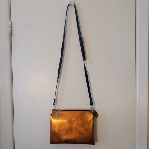 Orange PVC crossbody bag with monochromatic camo pattern (2nd image). Has a metallic look