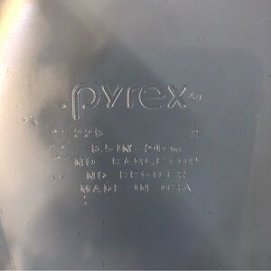 Underside: Pyrex, 9.5 in - 24 mL, No range top, No broiler, Made in the USA