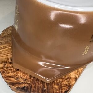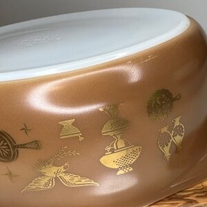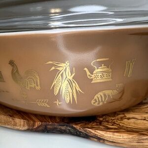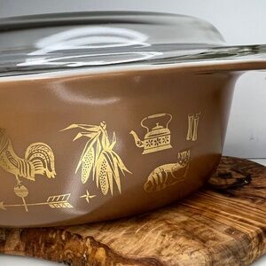 This vintage 60's PYREX Early American Casserole Dish with Lid is large holding 2.5 Quarts. It is a two-piece set in beautiful condition(see photos) with no chips or scratches! It has a brown background with a lovely gold print featuring country rural scenes. Made of durable Pyrex glass, this retro vintage casserole dish features a beautiful gold coloured pattern. The set was manufactured in the 1960’s and is an original Pyrex product.