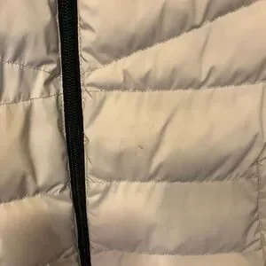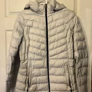 Off white packable puffer jacket. Flattering tapering and puff-lines. Great for spring/fall or traveling.