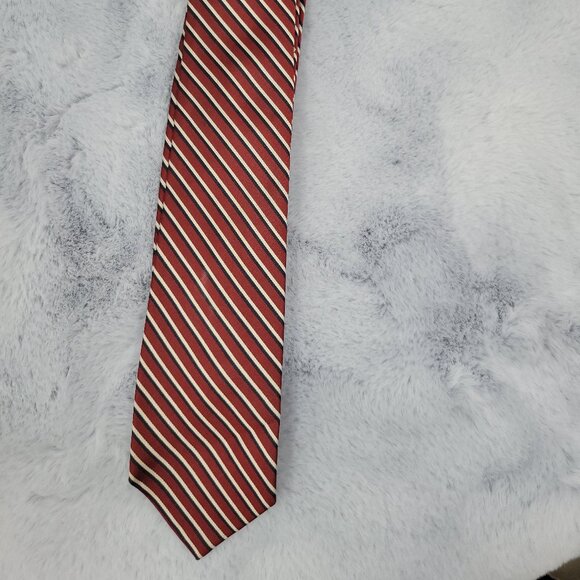 Paco Rabanne made in Canada neck tie in excellent used condition. Main colour is dark red with blue and silvery grey stripes. 54 inches long x 3 inches wide.
