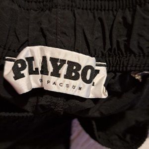 Pacsun Playboy men's size Medium black light weight nylon eladtic waist shorts, no liners, side seam pockets, embroidered logo, VGUC