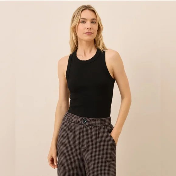Chic black tank top by Pact. Ideal for layering or wearing alone. Simple and stylish design. Soft and stretchy fabric.
