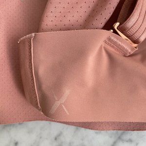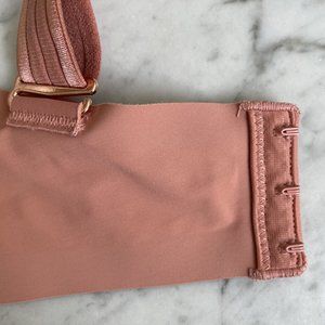 Medium support seamless bra with wider straps for added support. Removable cup inserts. Wide band with 4 rows of hooks for customizable fit. Meant to fit snug at first and loosen with wear. Colour is "pink ginger"