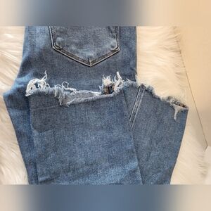 Trendy blue jeans with a frayed hem. Perfect for casual wear.