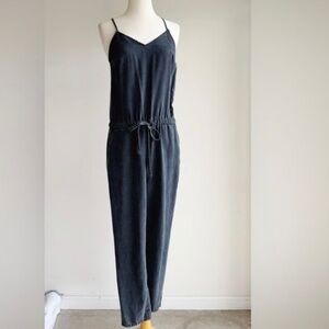 100% tencel. Adjustable shoulder straps. Drawstring waist. Side slant pockets. Hidden side zipper closure. Back patch pockets.