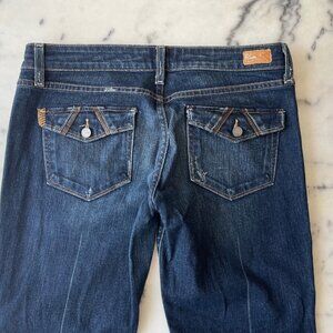 Paige Fairfax Low Rise Flare Denim. In excellent used condition, only worn a handful of times. Exceptional quality, has some stretch, perfect now that low-rise denim is coming back into trend. Some wear on the centre back of the hems.
