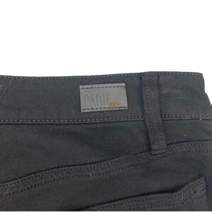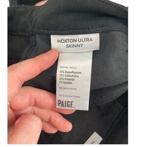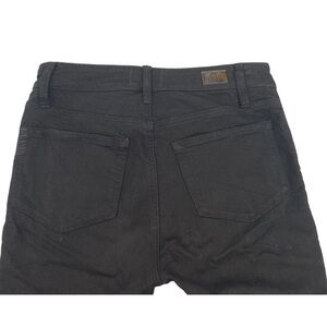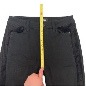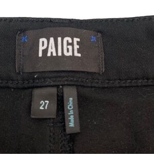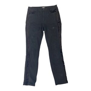 These are the Paige Hoxton ultra skinny jeans in a size 27. Black denim with black velvet tuxedo stripe detail down both sides to the top of the front pockets. Easy to dress up or down! These are a petite length of 26” inseam. Rise is about 10”. Waist measures about 28”, does have stretch