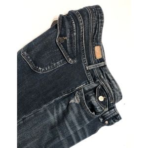 Slightly distressed, Paige jeans, 3 1/2" zipper, slightly flared legs, flap pockets on back with buttons