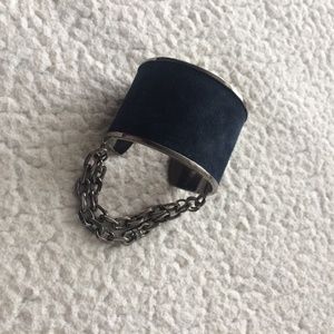 Elegance with an edge! Dark blue suede with silver toned metal and dark silver double chain.
