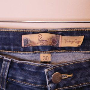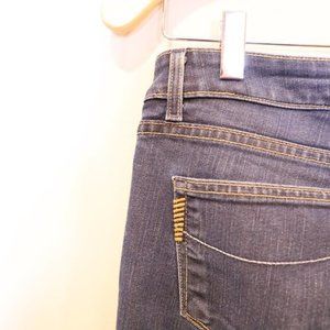 These denim leggings feature 5-pocket styling and a single-button closure. Stitching at back pockets and whiskering at front. Mild distressing.