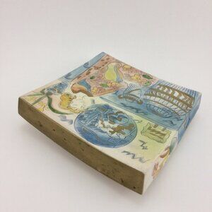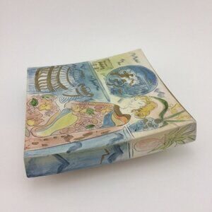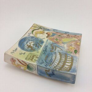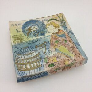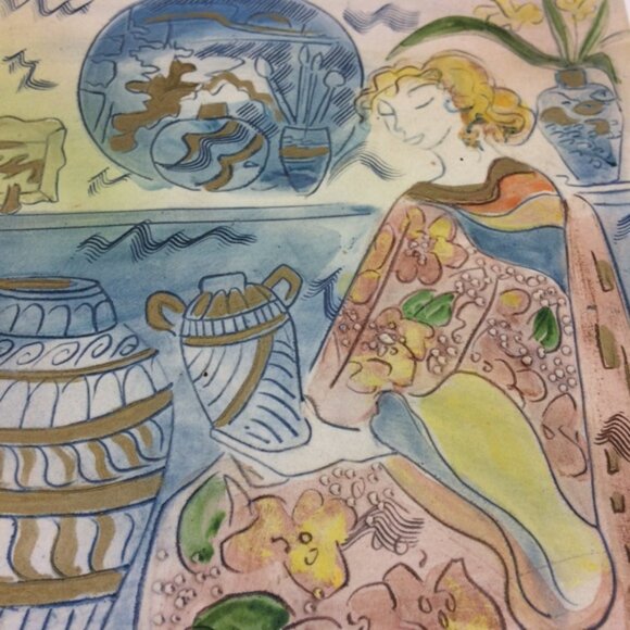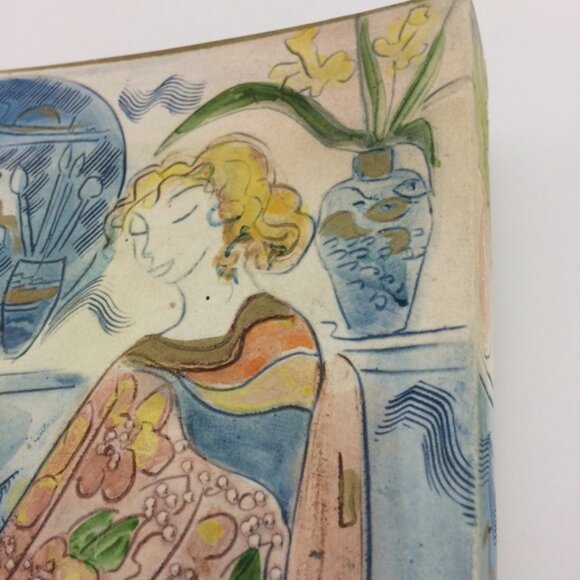 Painted Ceramic Wall Art Signed Woman with Flowing Floral Robe Gown and Pottery