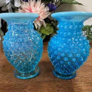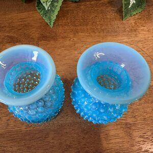 Charming Fenton blue opalescent hobnail vases—beautifully coordinated with distinct handmade characteristics