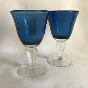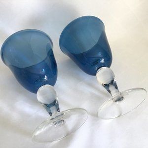 Pair Handblown Glass Wine Goblets Glasses Blue with Clear Base