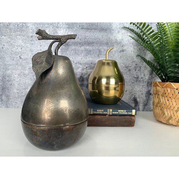 Pair Pear Trinket Boxes Brass Gold Tone Silver Tone MCM Vtg Decor Mixed Metal
