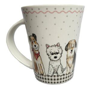 Pair of coffee mugs with cute dogs. One has checkered pattern on bottom, wavy line on top. The other has different dotted patterns on top and bottom.