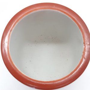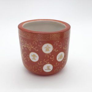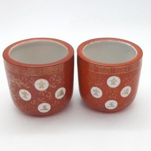 A pair of ceramic indoor planters or incense burners -I call them that but my other set box had "Lung Fung Burners" written on their box, Lung Fung being a chicken soup (Dragon soup) so perhaps they are soup bowls. In any case they are richly decorated with an orange background and Chinese characters. They are unused having come from a shop that shut down in 1987 and have sat in storage ever since.