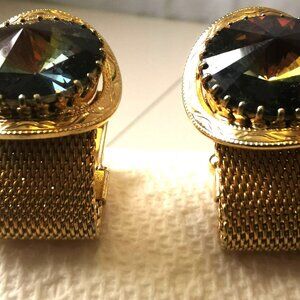 The cufflinks feature a gold color with multi-colored Rivoli glass stones.