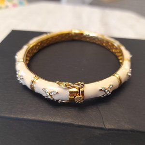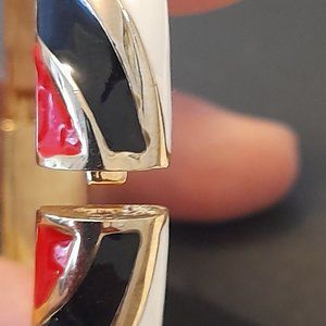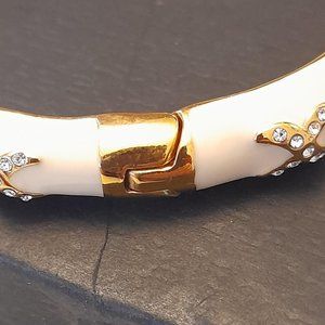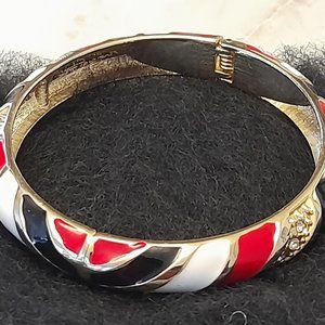 White Enamel Bangle is hand painted with gold tone X's filled with crystals with a mesh interior. Second bangle is also hand painted with black, red and white diagonal stripes and gold toned stripes with crystals. Both are in excellent condition.