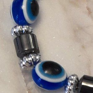 Pair of Evil Eye Bracelets and One Baby Pin with Pendants. The Bracelets are Elastic. All three items are in good condition. Please see photos for more details.