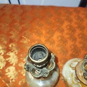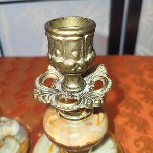 Pair of Hollywood Regency Marble/Onyx & Brass Candle Holders Approx 6 inches