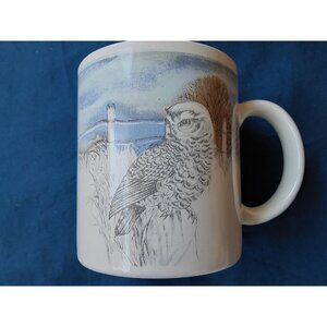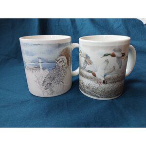Two vintage Otagiri coffee mugs, one with an owl an a fence post, the other with mallard ducks taking flight over a pond.