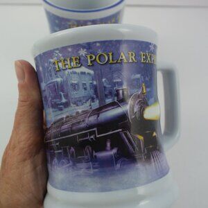 Set of 2 large Polar Express mugs, made of durable ceramic and featuring an embossed design of the Polar Express.