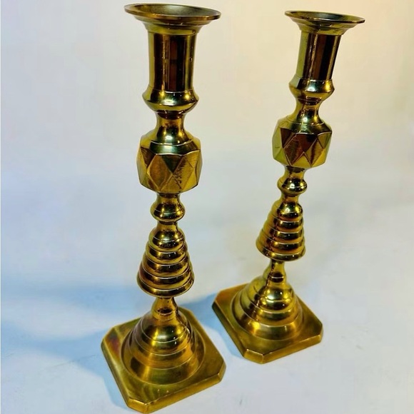 Pair of Vintage Brass Tapered Candleholders – 10.25” Tall. Mid Century Modern Geometric Design. Heavy Gold Brass Elegance.