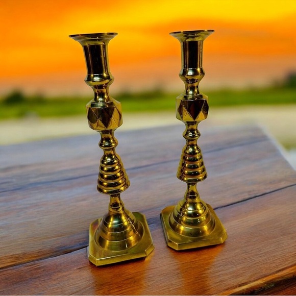Elevate your space with this stunning pair of vintage brass tapered candleholders. Standing 10.25” tall, these geometric beauties feature a sleek, mid-century modern silhouette and a rich gold-toned patina. Made from solid, heavy brass, they offer both visual impact and timeless durability.
