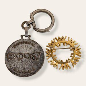 This pair of pieces come to us from Expo 67 and includes a keychain and a brooch. The brooch is made of a gold tone metal and has a modern c pin closure, while the keychain is double sided and made of a silver tone metal. Both feature the circular overlapping Y logo. The brooch is in good condition, and the keychain has visible wear on both sides. For collecting or wearing, the choice is yours!