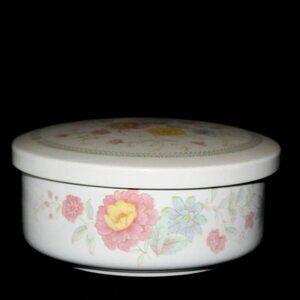 A lovely pair of lidded ceramic baking dishes with a cheerful floral design.