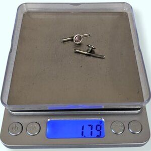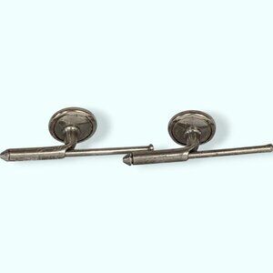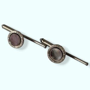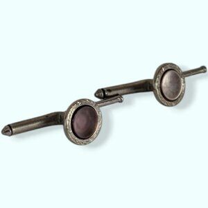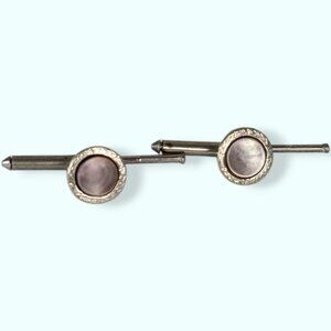 These two vintage shirt studs are made of a silver tone metal and have spring-loaded stick backs. Each stud features a round, purplish grey piece of mother of pearl with a slightly textured silver tone metal border. These pieces may have originally been part of a larger, more complete set but as of now, there are only the two pieces. There is normal wear in both pieces with the only "real" issue being that the springs are not as strong and springy as they once were.